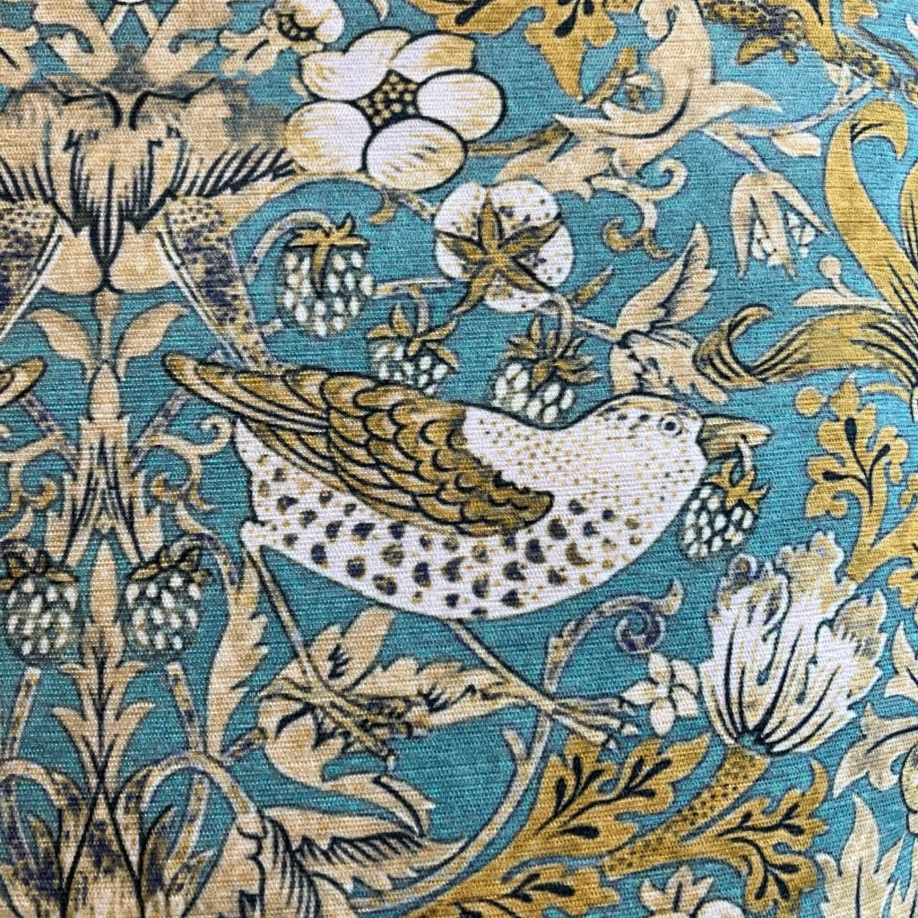 Striking “strawberry thief” design in gold, green, taupe and cream on a teal blue background in a cotton canvas fabric. The pillow is 20 inches by 20 inches with a 22 inch feather insert (additional fill is used for fullness in corners) and invisible zipper. The same fabric is used on the reverse. The pillow is made in North Carolina.