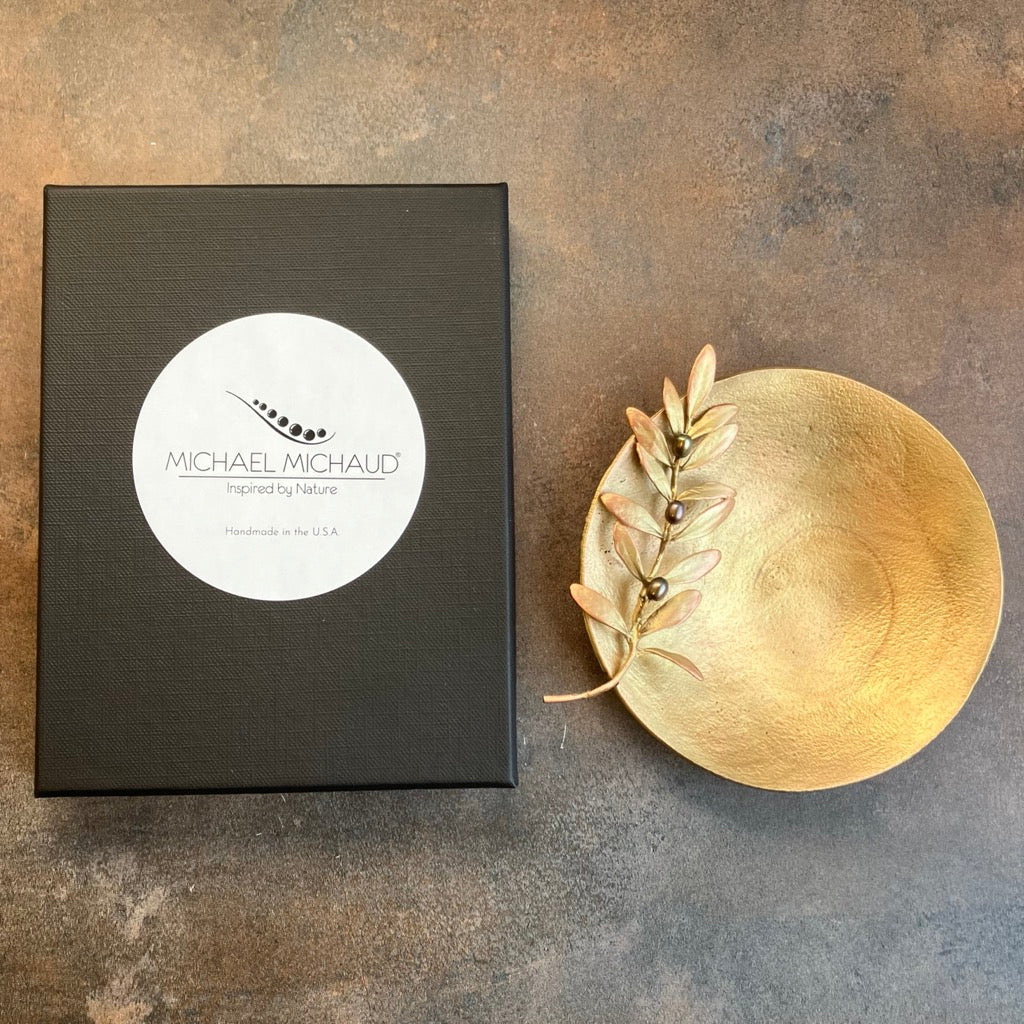 The Olive Dish by Michael Michaud is expertly cast in pewter, measuring 4.5 inches and featuring a distinguished antique pewter finish and peacock pearls. Its elegant olive design makes it an ideal choice for serving snacks or treats, as well as a striking decorative piece. To maintain its quality, hand wash gently with soap and water only.