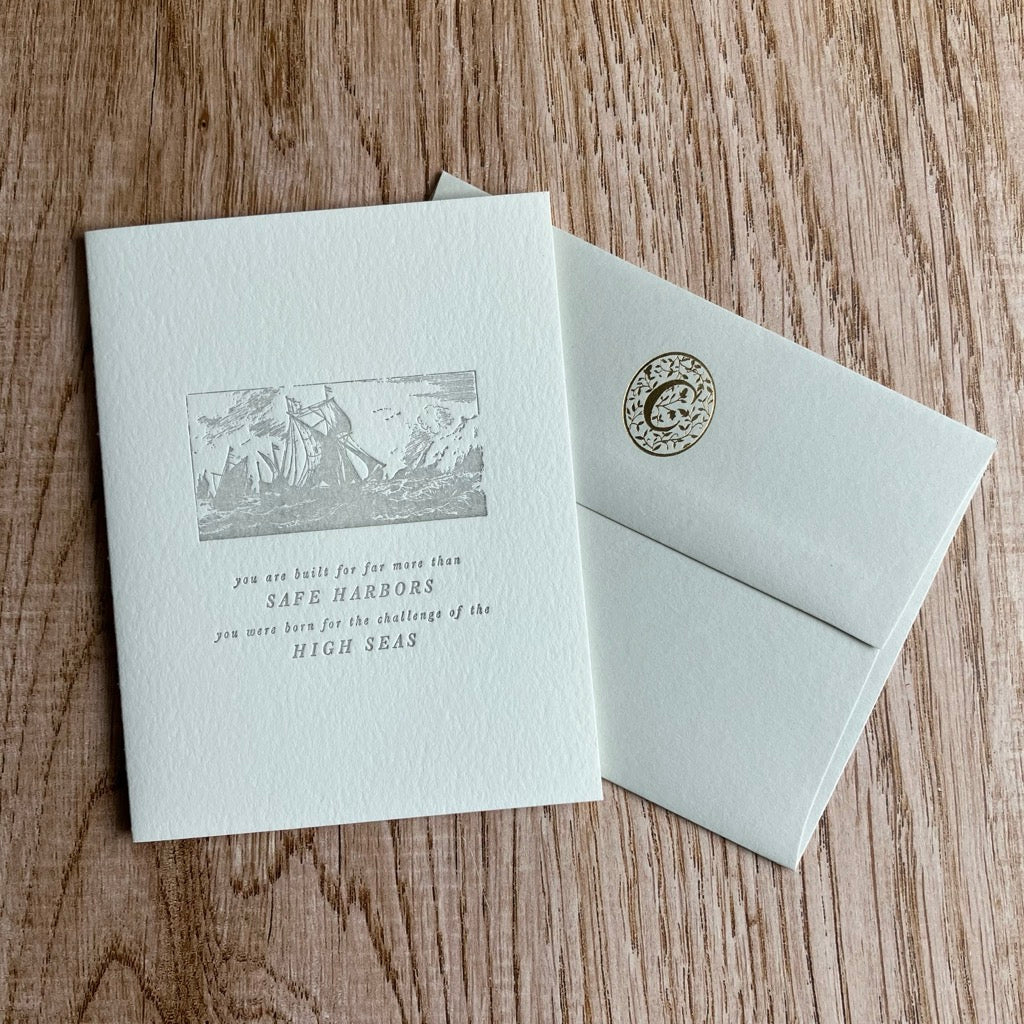 "You were not built for safe harbors. You were built for the challenge of the high seas.” Folded greeting card with blank inside to write a personal message. Gray letterpress.