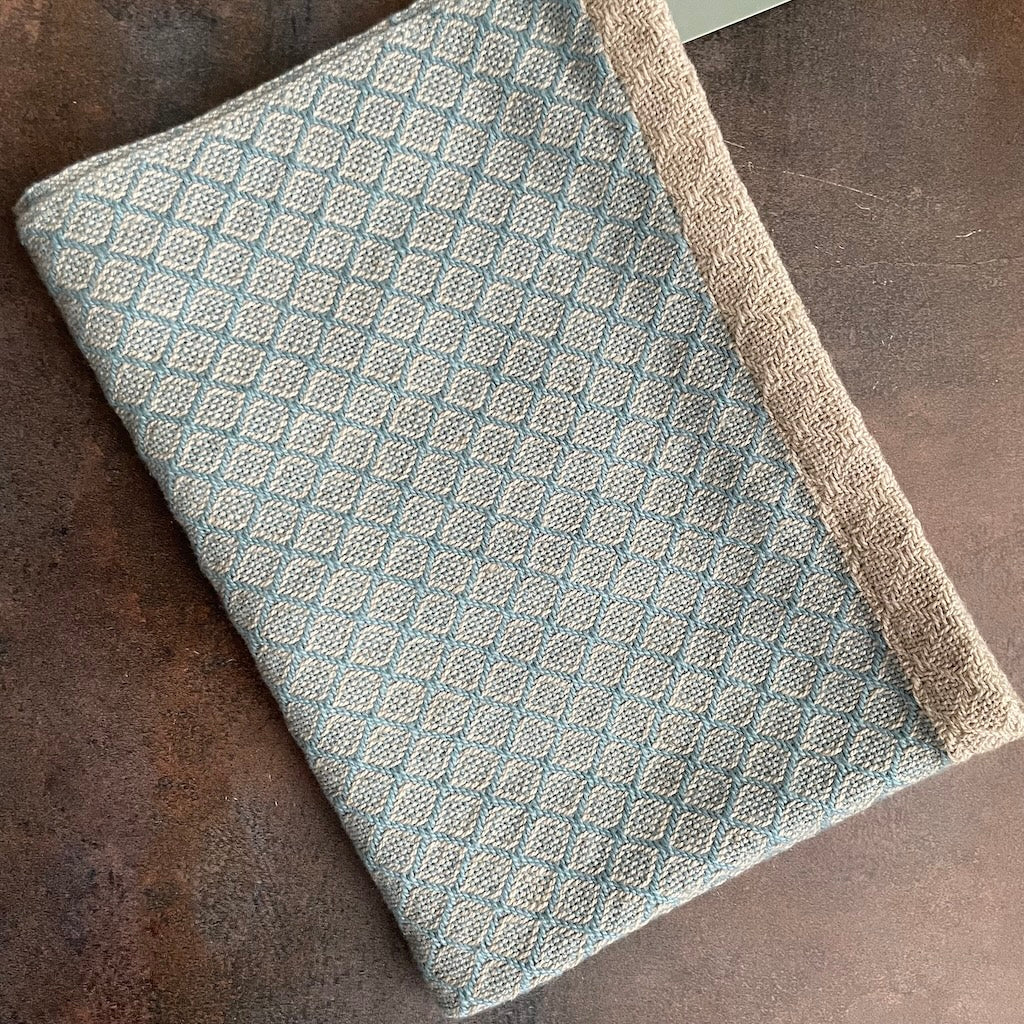 Cotton Hand Loomed Tea Towel / Hand Towel By Kristina Nichols in baby blue. Machine wash cold. Tumble dry low or hang dry. Warm iron if desired.