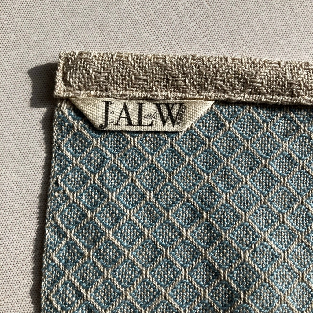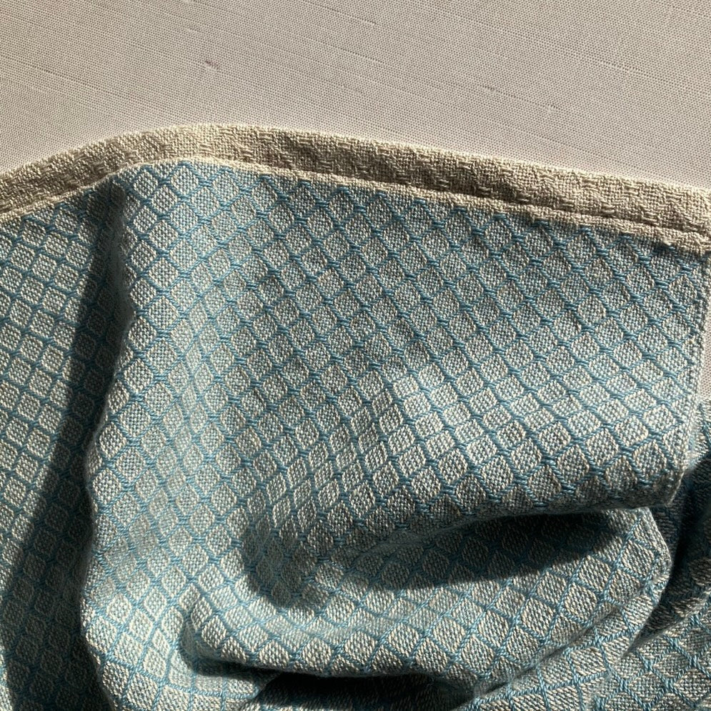 Cotton and Linen Hand Loomed Tea Towel / Hand Towel By Kristina Nichols in baby blue. Machine wash cold. Tumble dry low or hang dry. Warm iron if desired.