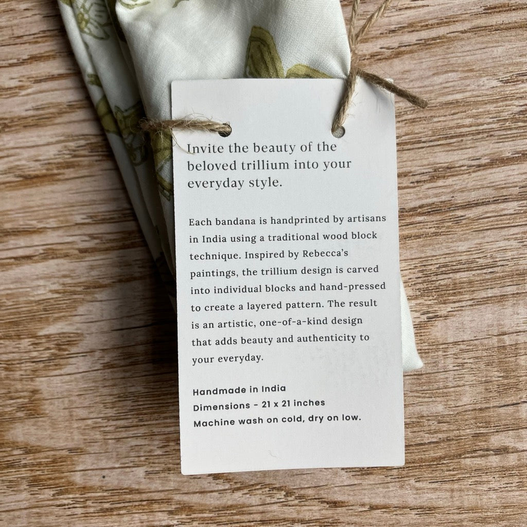 Invite the beauty of the beloved trillium into your everyday style. Each bandana is handprinted by artisans in India using a traditional wood block technique. Inspired by Rebecca’s paintings, the trillium design is carved into individual blocks and hand-pressed to create a layered pattern. The result is an artistic, one-of-a-kind design that adds beauty and authenticity to your everyday.